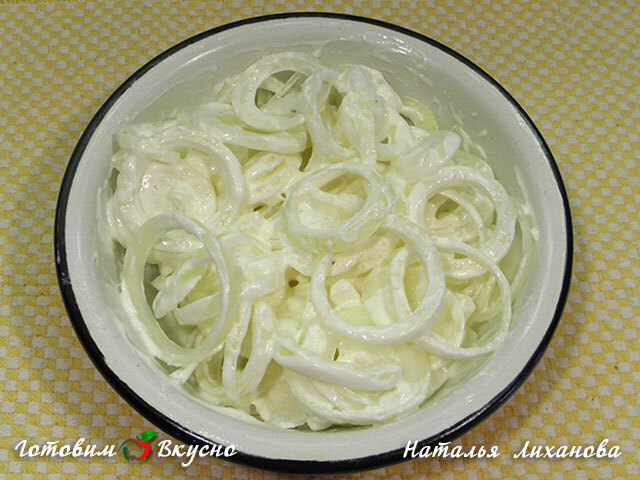 Tagliare la cipolla a fette spesse 3-5 mm e versare la salsa (maionese + panna acida), mescolare.