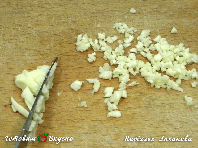 Para fazer a salada de feijão com croutons e coentro, pique o alho.