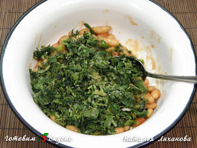 Coloque o feijão com molho em uma tigela, adicione o alho picado e o coentro picado.