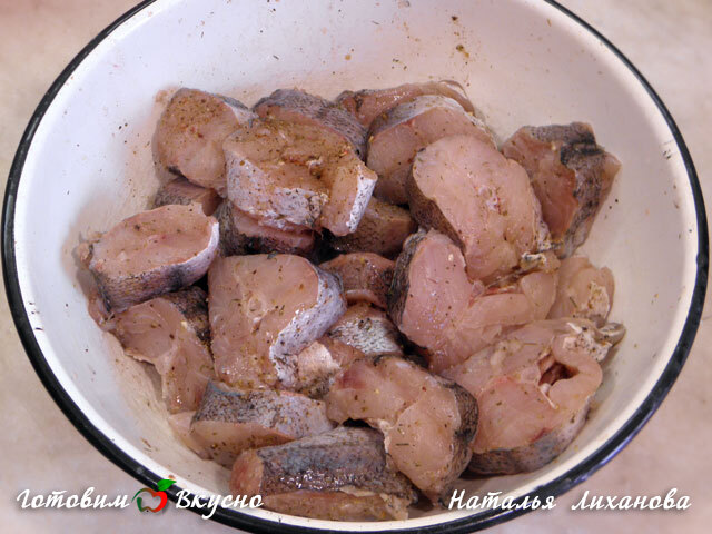 Para preparar o bacalhau frito, comece por preparar o peixe. Deve ser limpo, escamado (se necessário) e retirar todas as barbatanas. Lave cuidadosamente e seque com papel toalha. Corte os filés em pedaços iguais com 1,5-2 cm de espessura. Coloque em uma tigela, regue com suco de limão, adicione especiarias e misture delicadamente. Deixe o peixe marinar por 20-30 minutos.