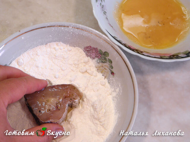 Num recipiente, bata ligeiramente os ovos com sal, noutro coloque a farinha. Passe cada pedaço de peixe primeiro no ovo e depois na farinha dos dois lados. Coloque em uma frigideira bem aquecida com óleo.