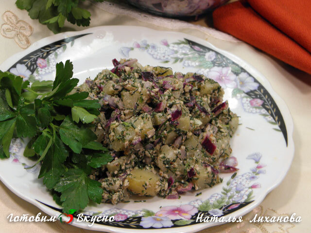 Para fazer a salada de batata com nozes e ervas, coloque as batatas com casca para cozinhar. Pique finamente a cebola, escalde-a com água fervente e depois escorra a água.