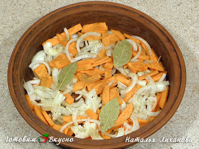 Coloque a cebola e a cenoura em um recipiente refratário (não é necessário untar com óleo) Tempere um pouco com sal, pimenta os legumes, coloque a folha de louro.