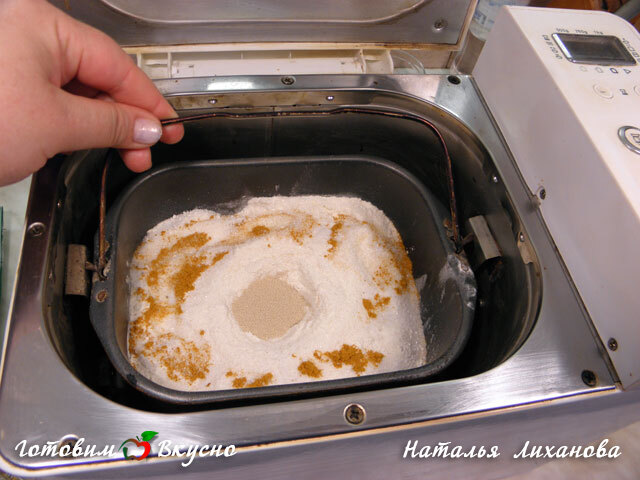 Em seguida, adicione a farinha (peneirada!), faça um buraco na farinha e coloque o fermento lá, e nas bordas polvilhe a cúrcuma. Coloque o recipiente na máquina de pão e ajuste o programa nº 4 "Pão Doce" ("Pão Francês" ou "Brioche"), modo "Cor clara da crosta", tamanho do pão o maior - 1 kg. Depois do sinal, adicione as passas.