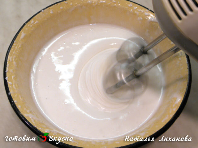 Enquanto isso, vamos preparar a cobertura para o kulich de Páscoa. Bata bem até obter uma consistência espessa, branca brilhante e lustrosa.