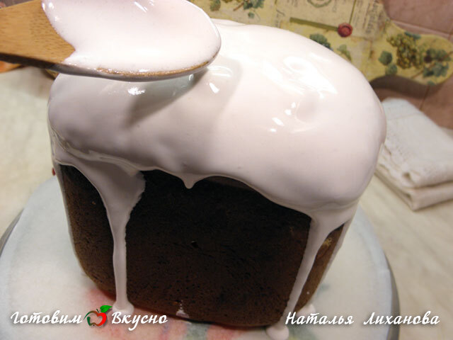 Aqui você pode soltar a imaginação, com um saco de confeitar e glacê de chocolate (ou qualquer outro creme) você pode decorar o kulich de Páscoa com todos os tipos de desenhos ou recortar flores e figuras de gelatina…