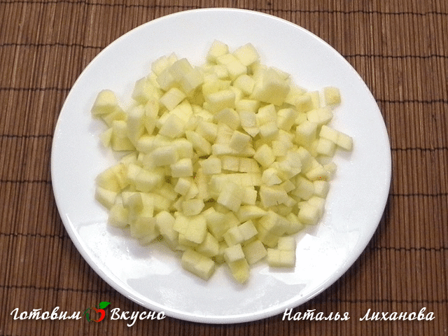 Descasque a maçã, retire o miolo e corte em cubos pequenos.
