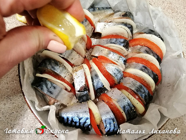 A cavala é um peixe bastante gorduroso e tem um sabor oleoso especial, que é perfeitamente realçado pela acidez dos tomates assados e limão. Como resultado, obtemos um prato delicioso que é feito em cerca de 20 minutos.