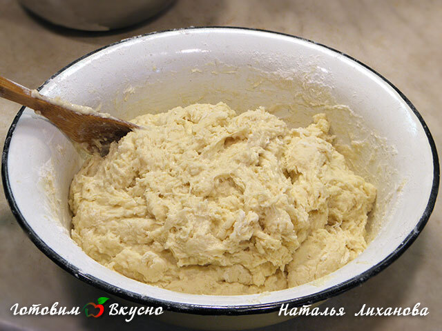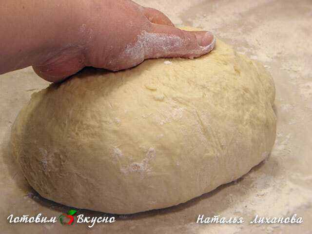 Тесто выкладываем на припыленный мукой стол и вымешиваем руками 10-15 мин. Тесто должно быть не очень тугое, не должно липнуть к рукам и столу, но и не должно плыть.