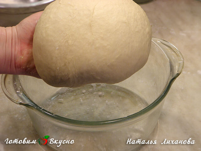 Кладем тесто в миску, накрываем пищевой пленкой и оставляем на 1,5-2 часа для поднятия в теплой комнате. В течении этого времени если тесто хорошо подходит и выходит за края формы, его можно обмять и снова поставить подходить.