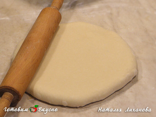 Подошедшее тесто выкладываем на стол делим его на две части. Берем одну часть и раскатываем в пласт толщиной 1 см.