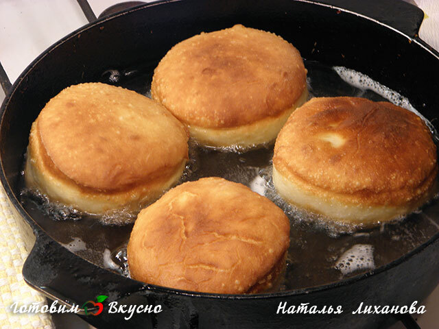 В сковороду наливаем масло и разогреваем его. Затем выкладываем аккуратно пончики и обжариваем их с двух сторон до румяного золотистого цвета.