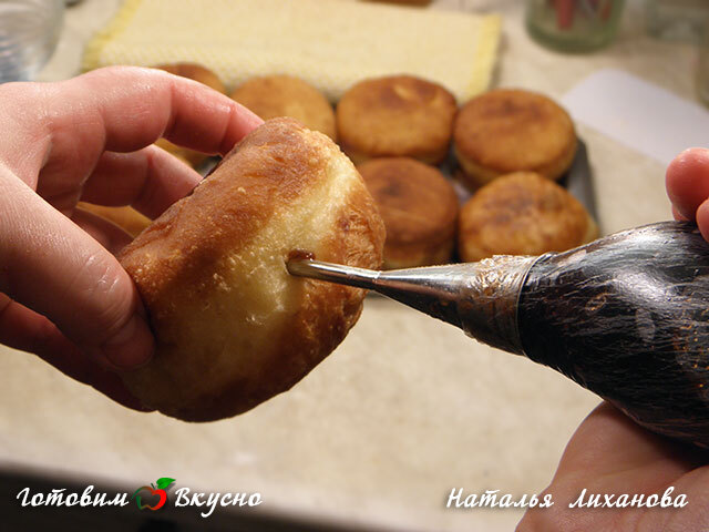 При помощи удлиненной насадки и кондитерского мешка наполняем берлинеры начинкой. А можно просто разрезать пончик (не до конца) и положить начинку.