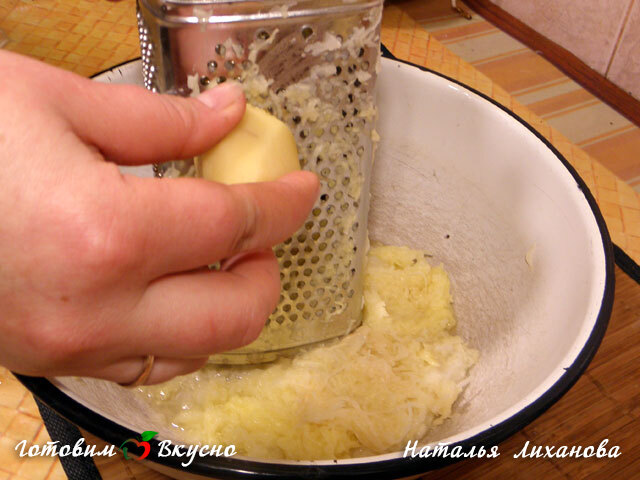 Для приготовления драников берем мелкую терку и трем поочередно лук и картофель.