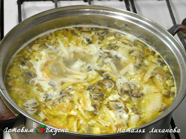 Чтобы приготовить куриный суп-лапшу с грибами, варим сначала бульон. Заливаем курицу водой (3-3,5 л) и ждем, пока он закипит. Потом добавляем лавровый лист, душистый перец. Варим еще 40 мин. Затем курицу вынимаем, режем на кусочки, а бульон процеживаем.