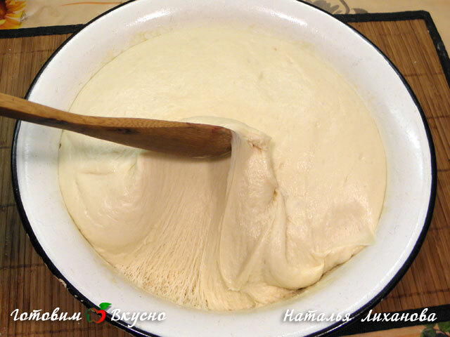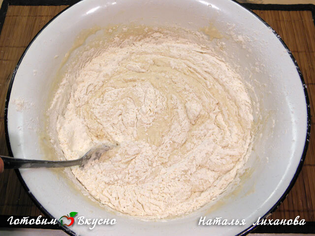 Затем постепенно добавляем просеянную муку и замешиваем некрутое тесто.