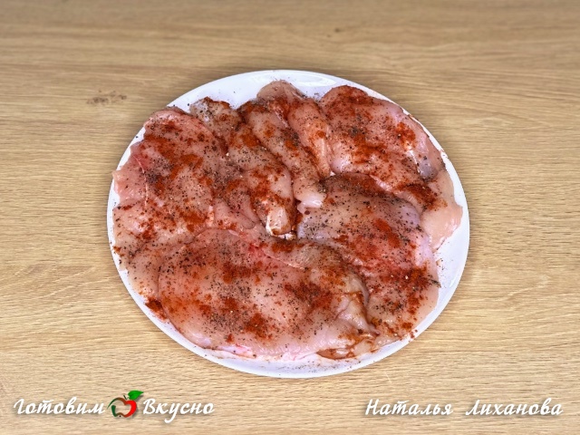 Для приготовления сливочного супа с курицей и помидорами берем куриную грудку и разрезаем ее вдоль на 2 или 3 части. Солим, перчим и приправляем ее копченой паприкой со всех сторон. Оставляем мариноваться на 20-30 минут.