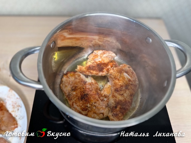 Затем в кастрюле обжариваем грудку на оливковом или любом другом растительном масле до золотистой корочки.