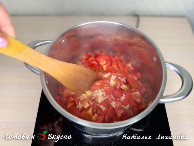 Курицу убираем и в этой же кастрюле обжариваем (1-2 мин) нарезанный мелким кубиком сладкий перец, помидоры и измельченный чеснок.