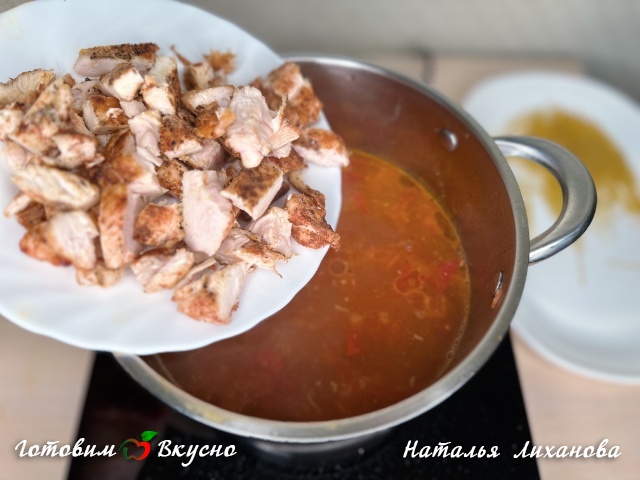Далее добавляем бульон, нарезанное небольшими кусочками мясо и спагетти ( я их поломала на более мелкие части) Варим все минут 10-12.