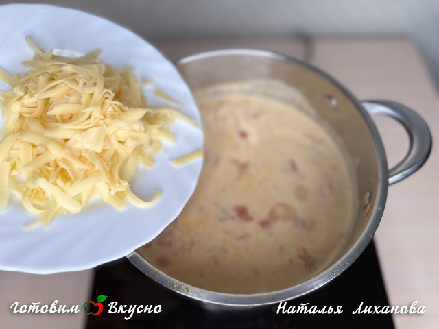 Последними добавляем сливки, натертый сыр и зелень. Доводим до кипения и сливочный суп с курицей и помидорами готов! Выключаем и наслаждаемся вкусом!