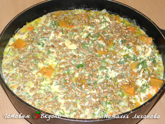 Обжариваем лук репчатый и чеснок на масле, добавляем тыкву, морковь и жарим 5 минут.Отдельно обжариваем семечки, половину добавляем в смесь.Для соуса яйца взбиваем со сливками и солью, добавляем сыр, имбирь, лук порей и перемешиваем.Овощную смесь заливаем соусом и равномерно посыпаем оставшимися семечками.