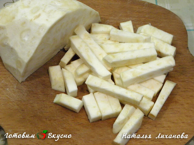 Для приготовления жареного сельдерея, корень очищаем и нарезаем брусочками.