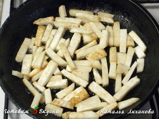 Сельдерей готовится быстрее чем картофель, так что лучше не отходить от сковороды.