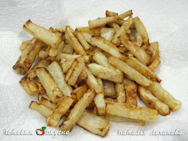 Готовый жареный сельдерей выкладываем на бумажную салфетку, чтобы удалить лишний жир. Подаем на стол, украсив зеленью.