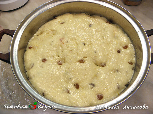 За допомогою дерев'яної ложки вмішуємо родзинки і цукати в тісто.