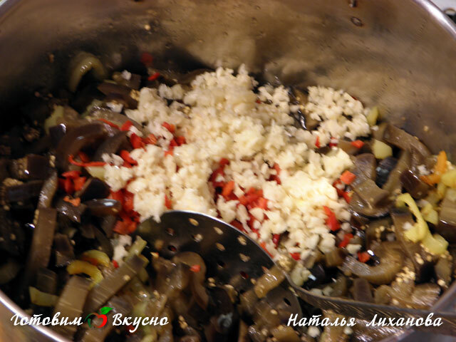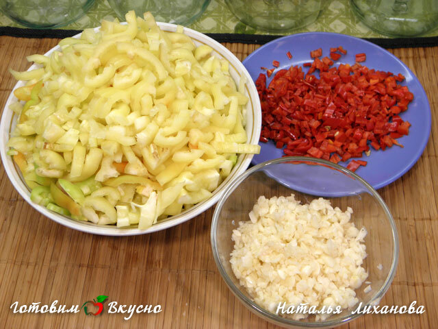 To prepare eggplant with garlic and sweet peppers, finely chop the hot pepper, garlic, and cut the sweet pepper into strips.