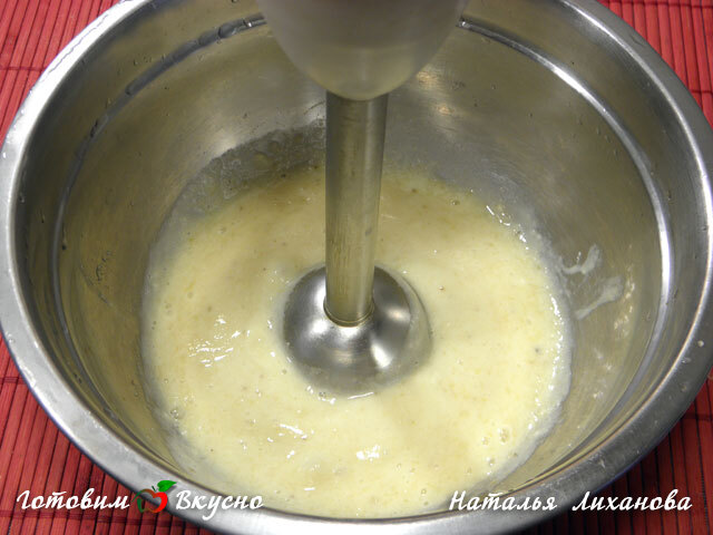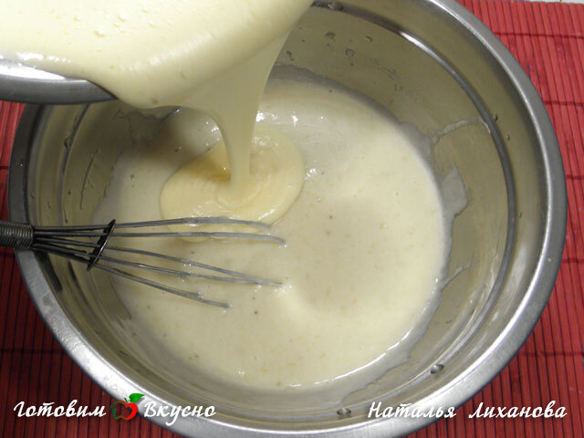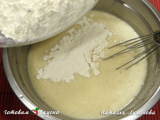 Separately, mix sifted flour, baking soda, salt and add to the prepared mixture. The batter should be a bit liquidy.