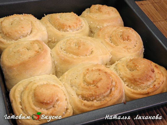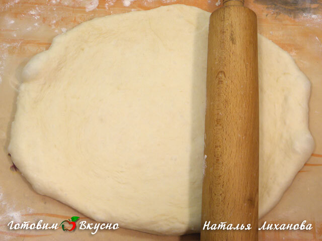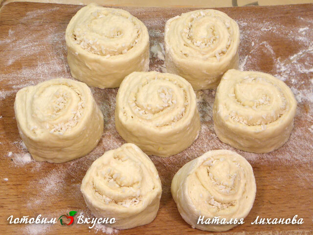 Roll up the sheet into a roll and cut it into pieces. Repeat with the second part of the dough.