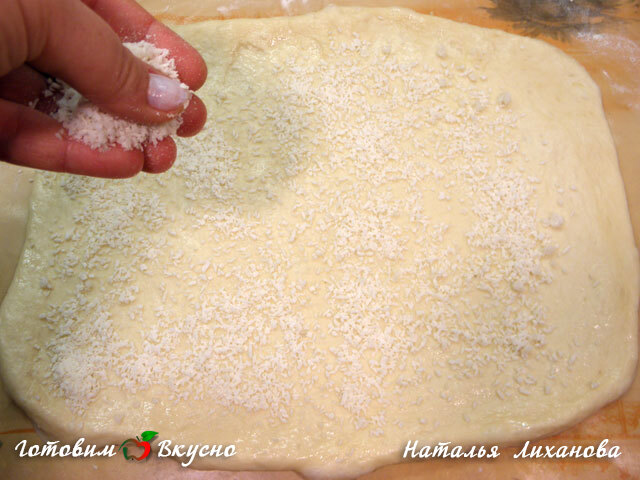 To prepare coconut flakes buns from these ingredients, prepare fasting yeast dough. Mix coconut flakes with sugar and flour for the filling. Divide the dough into 2 parts and roll out a rectangular sheet.