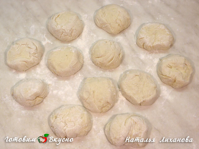 Once the dough has risen, place it on a floured surface, punch it down, and knead for a few more seconds. Divide it into 12 parts and shape into balls.