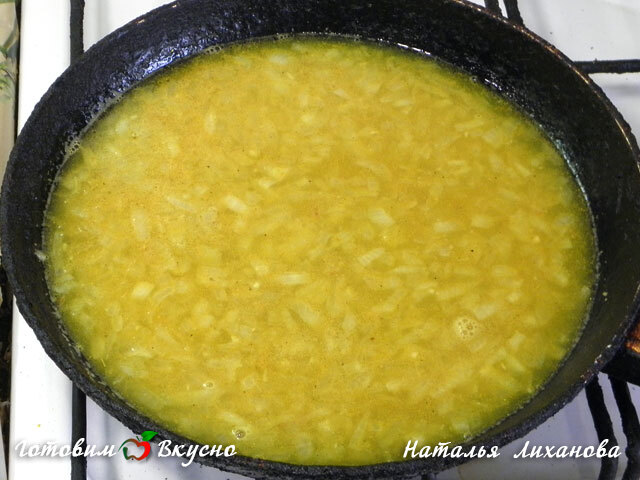 Heat sunflower oil in a pan and lightly sauté the onion and garlic. Then add curry powder, orange juice, vinegar, and vegetable broth.