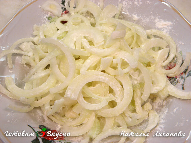 To prepare the fried onion and apple side dish, slice the onion into half rings and coat in flour.