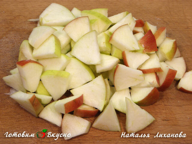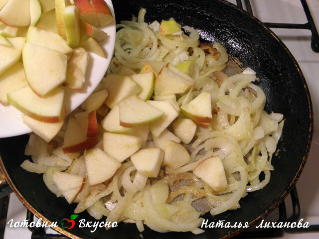 First, sauté the onion until slightly browned. Then add the apples, as well as salt, sugar, and pepper. Gently mix everything and sauté for another 2-3 minutes.