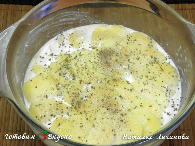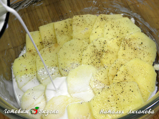 Grease a baking dish with a thin layer of butter and layer the bottom with the first layer of potatoes. Sprinkle with salt, pepper, and nutmeg to taste. Then add the next layer, season with salt, spices, and pour cream over each layer of potatoes, creating 4 layers.