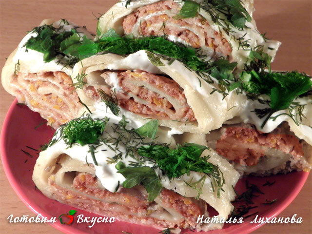 Slice the cooked roulades into pieces about 4-6 cm long and place them on a plate. Serve the hanum with sour cream and chopped greens - parsley, dill, and a little cilantro.