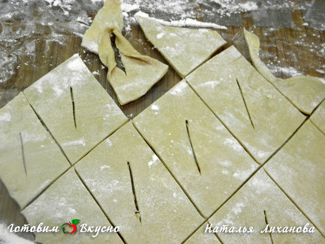 Next, roll out the dough thinly and shape it. Cut the dough into rectangles (or diamonds), make a cut in the center. Then thread one end through the slit to create a unique shape.
