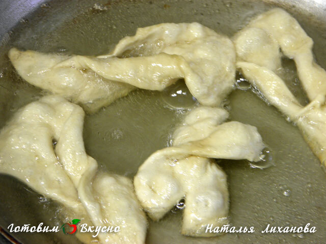 Heat a skillet on the stove, pour about 2 cups of oil and heat it up. The fat should be heated to the point where a drop of water, poured into it, produces a strong sizzle, but the fat is not smoking. Dip the fried pastry in the oil and fry on both sides.