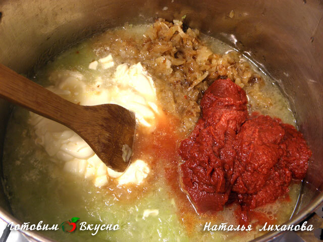 Then add fried onions, tomato paste, mayonnaise, and sugar. Mix everything and stew for 2-3 hours over low heat, stirring occasionally (it is preferable to use a splitter).