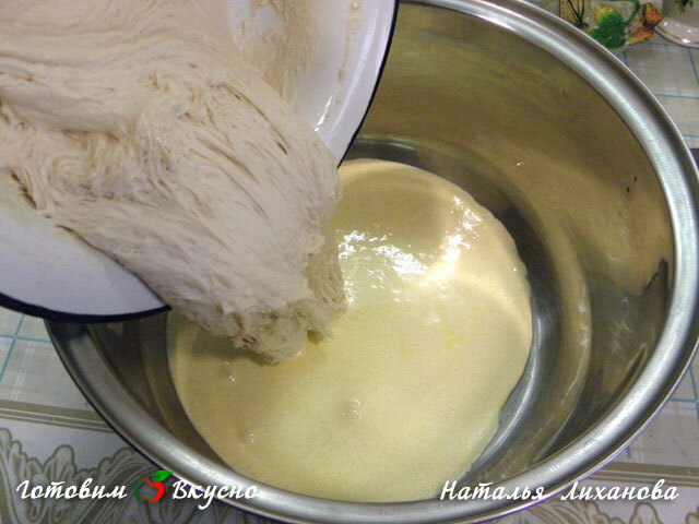 In a large bowl, add the beaten yolks, the risen sponge, and mix well.