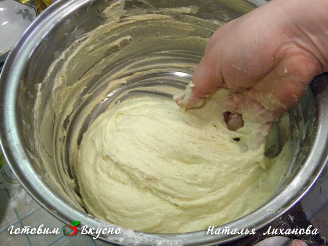 Next, add 500 g of sifted flour and knead the kulich dough by hand. This process is laborious and time-consuming, knead until the dough starts to come off the sides of the bowl. The dough should not be too thick. Cover the dough with plastic wrap, a towel, and place in a warm spot for 1.5-2 hours.