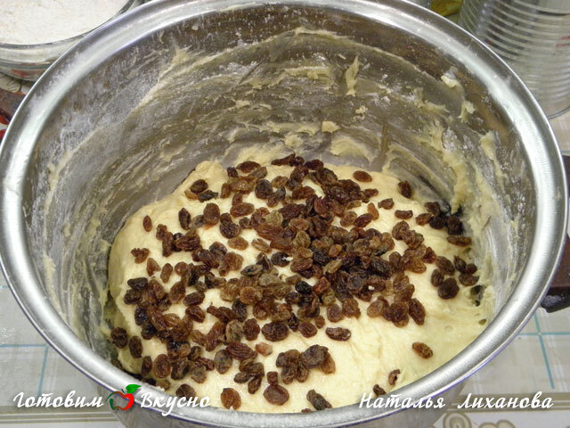 When the dough doubles in size, punch it down and add washed and dried raisins, mix to evenly distribute the raisins in the dough.