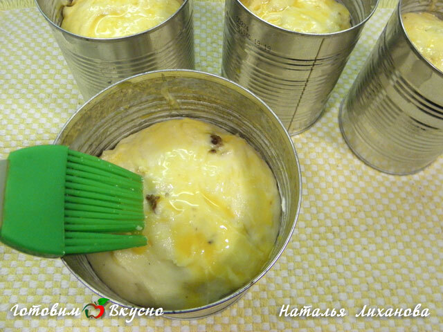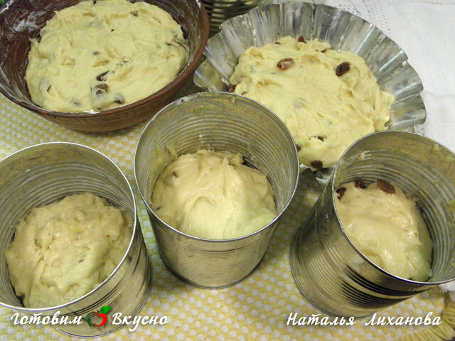 Place parchment paper on the bottom of the kulich molds, cutting out a circle of the required diameter, grease the circle with butter. Grease the sides of the molds well with butter or margarine. Fill the molds with dough to 1/3 of the height, place in a warm spot and cover with a towel.