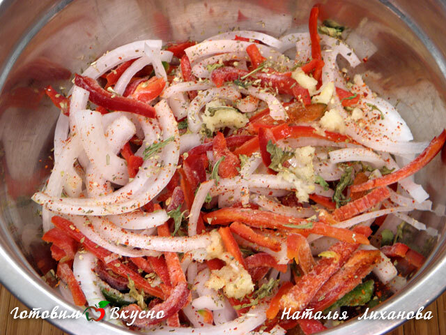 To prepare chicken fillet in soy sauce with vegetables, start by cutting the vegetables. Slice the bell pepper into strips, and the onion into half-rings. Sprinkle with herbs, add red pepper and grated garlic clove.