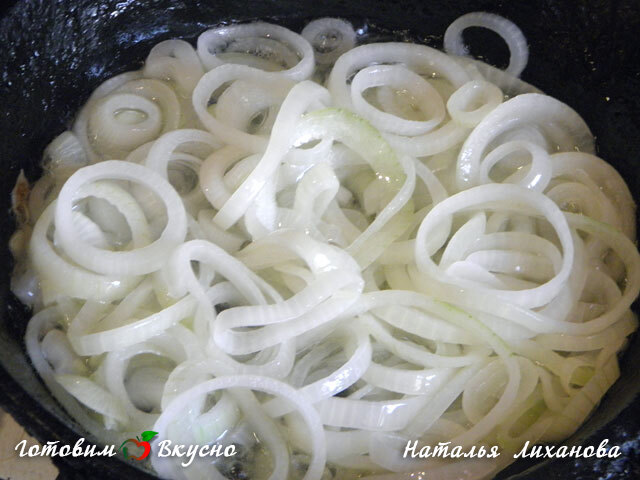 Then sauté the onion in sunflower oil for 5-7 minutes over medium heat. Constantly stir the onion to make it soft without browning.