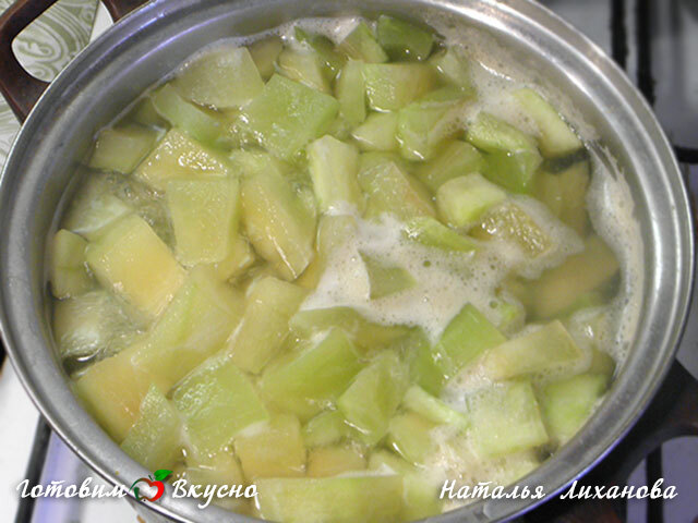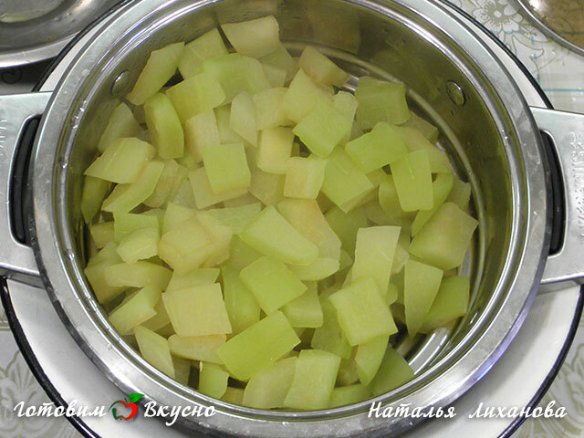 To prepare pickled watermelon rinds, take the rinds and peel them: cut off the green skin and red flesh. Cut into small pieces (or large, according to your preference).